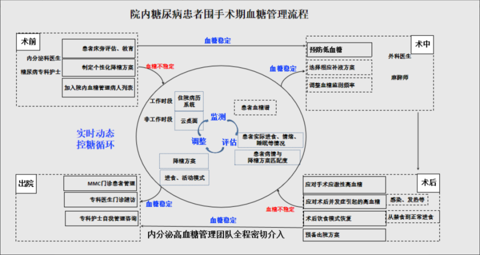 以“围手术期患者血糖管理”为例,当患者连续2次血糖>16.7mmol/L,电子病历系统自动弹窗提示“发起内分泌会诊”。纳入全院血糖管理后,在“监测-评估-调整”精准闭环管理的流程中,协助完成术前准备、术中管理、术后康复及出院后的专业随访等围手术期全程血糖管理模式。具体参照图2围手术期院内高血糖管理标准化流程。
