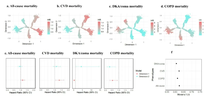 图2. 新诊断2型糖尿病全因及特定死因死亡风险异质性的可视化