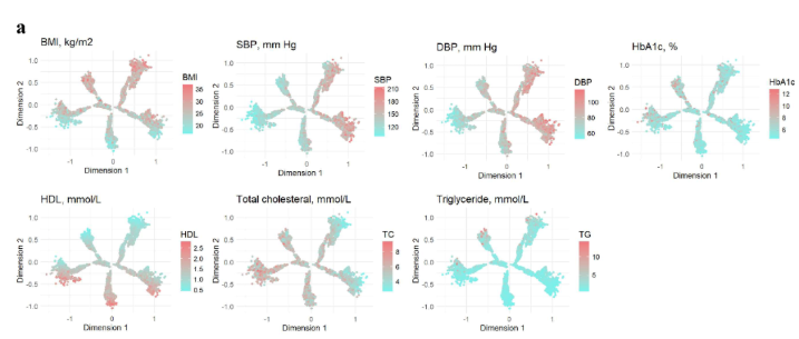 该研究基于中国全国代表性人群(CCDRFS),纳入10 091名新发2型糖尿病患者。研究团队创新性地应用判别降维树算法(DDRTree),将常规临床指标(如HbA1c、BMI、血压、血脂)转化为直观的“树状图谱”,在二维结构中展示患者表型的连续分布。图谱上的每个点代表具有特定表型特征的个体,混合特征的患者位于主树干中心,极端表型逐渐延伸至树梢,从而更清晰地呈现糖尿病的异质性,避免了传统“硬性分类”的局限。