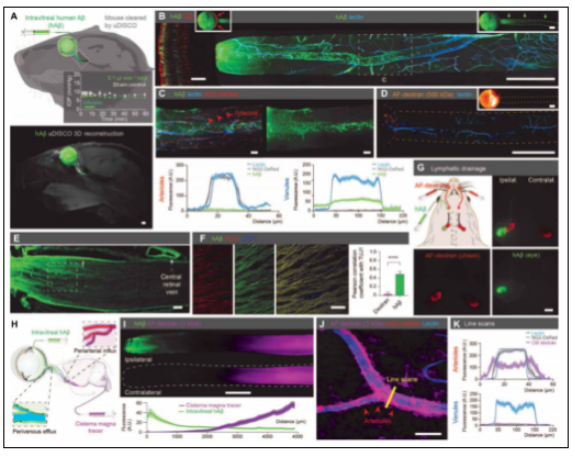 为了搞清楚眼部是否确实存在类淋巴系统,科学家将实验室小鼠选为研究对象。通过将荧光标记的示踪剂(包括标记的人淀粉样蛋白-β)注射到小鼠眼内的玻璃体中,研究人员能够追踪有毒淀粉样蛋白从视神经离散通道移出眼球的过程。废物最终穿梭到颈部的淋巴管中。(图1)