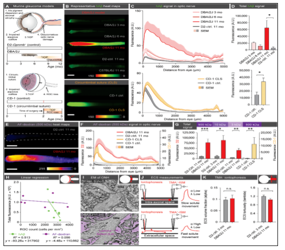 眼睛的内部结构被包含在狭窄的空间内,与大脑类似,因此必须严格维持液体稳态。传统的淋巴管起着维持液体循环和废物清除的作用,但眼睛和大脑一样,缺乏这样的淋巴管。近年来,人们发现大脑拥有独特的“类淋巴”(glymphatic)系统。正常情况下,这种运输系统会从大脑中转运出神经毒性蛋白(例如β-淀粉样蛋白,淀粉样蛋白积聚会导致一系列疾病)。