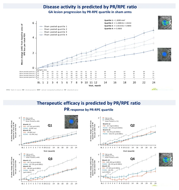 3.预测进展,开启预防性医疗新纪元:对于萎缩型AMD(GA),AI可通过计算“光感受器层与视网膜色素上皮层厚度比值(PR/RPE)”,有效预测疾病进展速度。比值高的患者通常进展更快,但可能对新型疗法(如补体抑制剂)反应更佳。这意味着AI不仅能描述现状,更能预测未来,为在高风险患者出现不可逆损伤前进行早期干预提供关键依据。