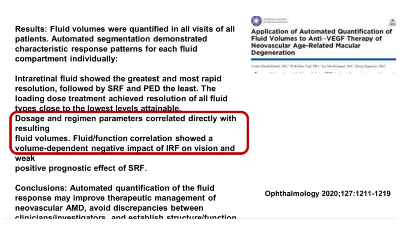 1.精准量化,超越人眼极限:系统基于包含超过4万次OCT扫描的庞大数据库(VIBES研究)训练,可自动识别并精确计算视网膜内液(IRF)和视网膜下液(SRF)的体积,精度达到微米级别。这彻底改变了以往仅靠测量“中央视网膜厚度”的粗略指标,因为研究证实,液体体积与厚度并无直接关联,不同性质的液体(IRF、SRF)对视力的影响和消退规律完全不同。