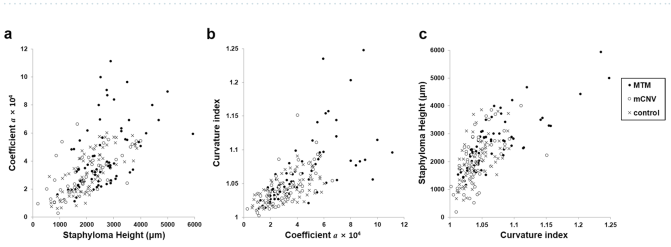图2. 散点图描绘了不同方法之间葡萄肿曲率测量的相关性。(a)葡萄肿高度与系数a。(b)系数a与曲率指数。(c)曲率指数与葡萄肿高度。所有比较均表现为显著正相关(P <0.001)。MTM:近视牵引性黄斑病变,mCNV:近视脉络膜新生血管。
