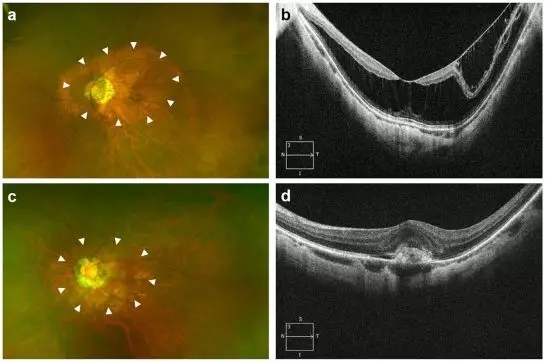 图1. 伴有近视牵引性黄斑病变和近视脉络膜新生血管(mCNV)患者具有代表性的广角视网膜图像和光学相干断层扫描B扫描图像。(a,b)一名患有黄斑劈裂的50岁女性(眼轴长度29.1 mm,屈光不正-12.75 D)。可见广泛的黄斑区葡萄肿(箭头)。其中心凹曲率参数如下:葡萄肿总高度为3,028μm、系数a为4.78×10?4、曲率指数为1.066。(c,d)一位患有mCNV 的61岁男性,(眼轴长度29.9mm,屈光不正-12.25 D)。可见广泛的黄斑区葡萄肿(箭头)。尽管与前者的眼轴长度和屈光不正程度相当,但他的曲率参数却较小:葡萄肿总高度1696μm、系数a为3.40×10?4、曲率指数为1.031。