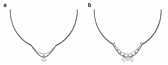 图3. 在后葡萄肿曲率较陡的眼中,葡萄肿的后极可能主要在前后牵引下导致视网膜神经改变和近视牵引性黄斑病变(a)。曲率较浅的后葡萄肿扩大可能是多方向性的,葡萄肿的顶端可能主要是切线方向牵引导致Bruch膜/视网膜色素上皮破裂并随后导致脉络膜新血管形成(b)。
