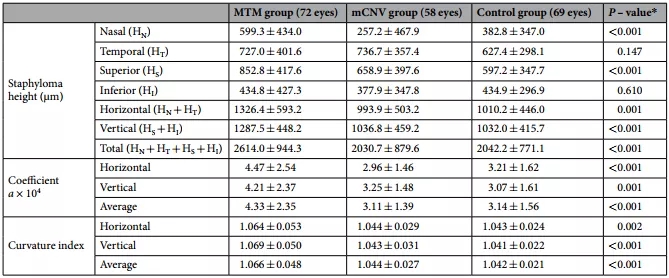 在这些存在后巩膜葡萄肿的高度近视眼患者中(眼轴长度≥26.5 mm、屈光不正度数≤-6D),研究者根据视网膜色素上皮在光谱域光学相干断层扫描图像中的高反射线,分别对MTM(72眼)、mCNV(58眼)和对照组(69眼)中三个不同的中心凹曲率参数(巩膜葡萄肿程度、系数a和曲率指数)进行了测量和比较。