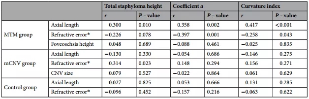 表3. 近视牵引性黄斑病变组、近视脉络膜新生血管形成组和对照组曲率参数与眼轴长度、屈光不正和严重性参数的相关性。MTM =近视牵引性黄斑病变, mCNV =近视脉络膜新生血管。*排除假晶状体眼(MTM 10眼,mCNV组6眼,对照组5眼)。