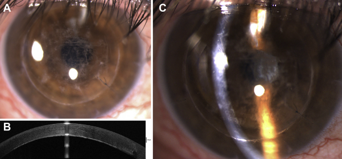 通过裂隙灯检查发现明确的供体基质和多态后基质混浊,如图A。