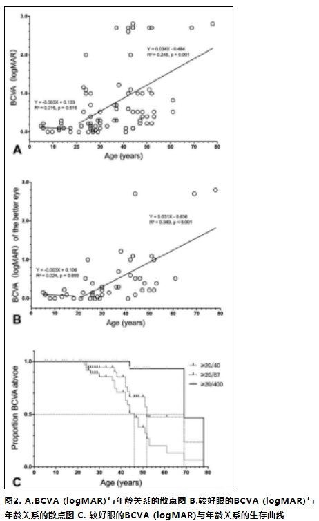 48个患者的首次就诊年龄为31.5(±16.6)岁(分布,5-78岁)。除了一个6岁患者,所有的患者均主诉有夜盲的症状。夜盲是这些患者最初的症状。患者logMAR视力的平均值为为0.71(±0.87)(分布,0.00-2.80),大致相当于Snellen视力的20/200。小于20岁的患者(n=10)的logMAR视力平均为0.106,与正常人没有统计学差异。而年龄越大,BCVA不好的比例越高。BCVA与年龄的散点图显示患者20岁前还能保持良好的视力,而在20岁后明显下降(图2A)。因此研究者使用了双模型来描述BCVA与年龄的关系。在小于20岁组,BCVA(logMAR)与年龄没有相关性(R2 =0.016; P = 0.616; Y = 0.133–0.013X),可是在大于20岁组,两者有显著相关性(R2 = 0.248; P <0.001; Y =-0.484 + 0.034X),即每年BCVA的变化为0.034logMAR(P<0.001)。为了能更好地与其他研究相对比,研究者又对所有患者较好的那只眼进行了相关分析,同样的在大于20岁组,BCVA与年龄有显著相关性(R2 = 0.340; P<0.001; Y = -0.636 + 0.031X)(图2B),即每年BCVA变化为0.031logMAR。对较好眼的BCVA进行生存分析发现一半的患者视力到达logMAR0.22(20/40)、0.52(20/67)、和1.0(20/200)的年龄分别约为46、52、69岁(图2C)。本研究中患者出现视力损害的年龄明显早于其他基于西方人群的研究。