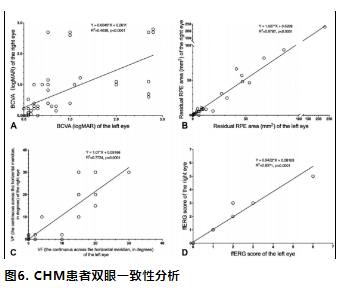 最后利用视觉功能(BCVA、视野、ERG分值)和视网膜结构(AF上剩余RPE面积)来评估患者双眼病情的一致性。相关分析发现双眼BCVA呈中等程度一致(R2 = 0.4039; P <0.0001;图6A),双眼的剩余RPE面积呈现极强的一致性(R2 = 0.9787; P <0.0001;图6B),双眼视野呈现强一致性(R2 = 0.7724; P <0.0001;图6C),双眼ERG分值呈现极强的一致性(R2 = 0.9371; P <0.0001;图6D)。因而作者更推荐使用RPE残留面积作为治疗前后双眼对照的指标,而BCVA虽然双眼仅呈中度一致,但鉴于它是反应日常生活能力的重要指标,也应该作为确定治疗窗、评估候选人群的参考。