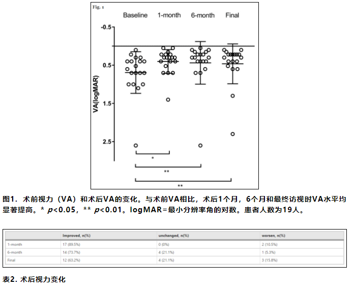 2.最终视力从0.69±0.55显著提高到0.46±0.52 logMAR,其中12眼(63.2%)视力提高,4眼(21.1%)保持不变,3眼(15.8%)视力下降(图1、表2)。