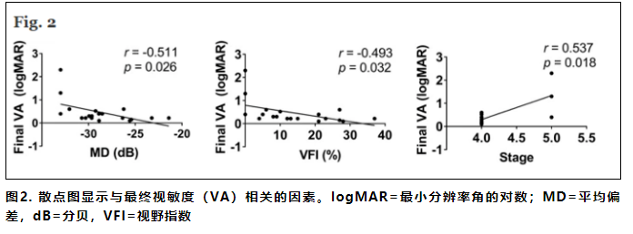 3.线性回归分析表明,较高的平均偏差,较高的视野指数和较低的青光眼分期与较好的最终视力有关(r=-0.511,r=-0.493,r=0.537)(图2)。
