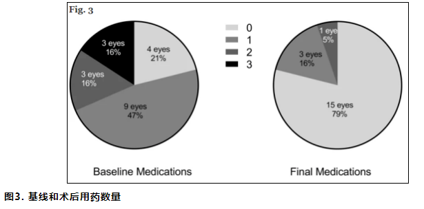 6.无药物治疗的眼数从术前的4眼(21.1%)增加到术后的15眼(78.9%)。