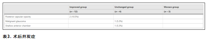 据报道,白内障摘除术可改善青光眼患者的视力,其中的青光眼患者大多数处于早期阶段或眼压不可控。在临床工作中,眼压一直是青光眼治疗的重点,而视力很少被视为青光眼患者治疗效果的评估参数。但是,视力情况高度反映了患者的生活质量。在这里,我们开创性地提供了以下信息:在眼压可控的重度和晚期PACG患者中,平均视力从0.69±0.55提高到0.46±0.52 logMAR,平均随访时间21.89±7.85个月。该结果令人兴奋,因为此前对这部分患者的视力情况了解甚少,也很难单独量化由白内障或青光眼引起的视力下降,但基于这项研究,我们可以给出建议:这些患者行白内障手术可以改善视力。同时,我们的结果显示(表3),总体而言,白内障手术对于患有重症和终末期青光眼患者是安全有效的。
