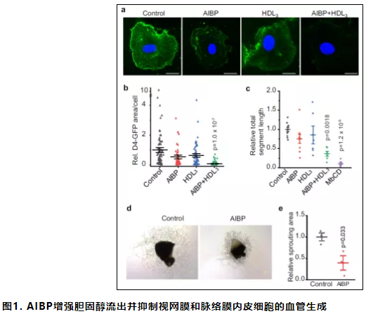 1.AIBP抑制视网膜和脉络膜内皮细胞的血管生成。AIBP和HDL一起通过增强胆固醇的流出来限制人脐静脉内皮细胞(HUVEC)的血管生成。