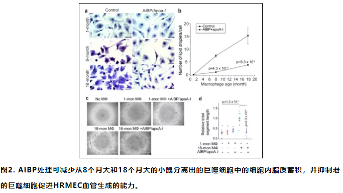 2.AIBP抑制衰老的巨噬细胞促进血管生成的能力。先前的研究表明,衰老的巨噬细胞表现出受损的胆固醇通量,导致细胞内脂质蓄积和病理性血管增生。我们的数据表明AIBP / apoA-I治疗可抑制衰老的巨噬细胞促进血管生成的能力。