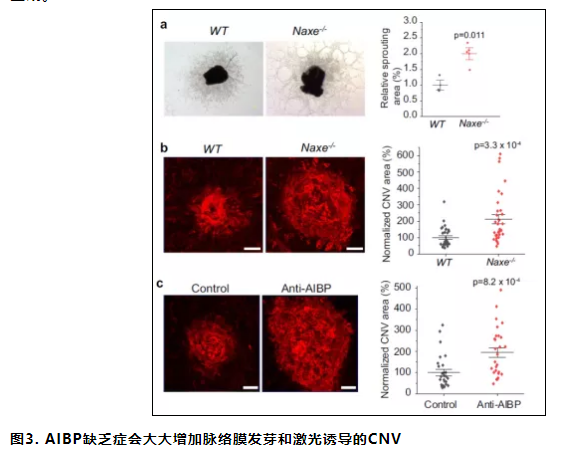 3.AIBP缺乏会加速视网膜和脉络膜血管生成。已显示AIBP缺乏会明显促进发育中的视网膜CNV生成。