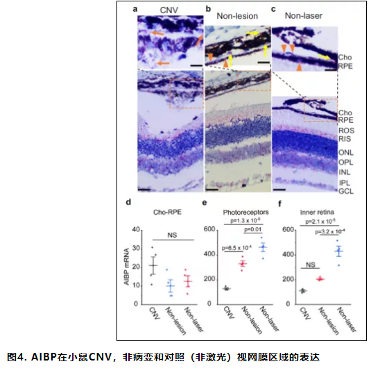 4.AIBP表达在激光诱导的鼠CNV和人CNV中降低。
