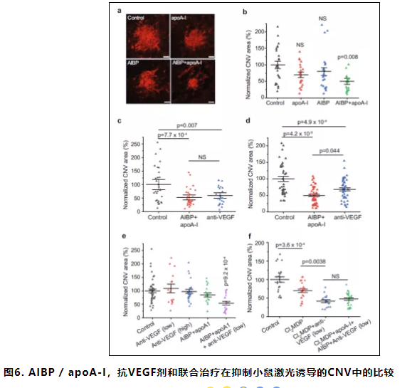 7.巨噬细胞耗竭可恢复CNV对抗VEGF治疗的敏感性。抗VEGF的耐药性可能是由老年小鼠体内富含胆固醇的巨噬细胞引起的。实验表明,AIBP / apoA-I治疗可以通过靶向衰老的巨噬细胞来增强抗VEGF治疗的有效性。最简约的解释是AIBP增强了从旧巨噬细胞中去除胆固醇的能力,这抑制了它们促进病原性血管生成的能力。