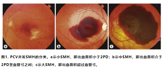PCV并发SMH的发病机制是由于动脉瘤样扩张的血管或管径增宽的小静脉/小动脉的破裂所导致。Cho JH 等人的研究发现当PCV患者眼底ICG中出现“团簇样polyps” 或“持续存在的polyps”时,发生SMH的风险明显增加。PCV并发SMH依据出血范围及厚度可进行分类:当出血面积小于2PD考虑为“小SMH”;当出血面积介于2PD至血管弓之间为“中SMH”;当出血面积超过血管弓则为“大SMH”(见图1);当出血高度超过500μm则为“厚SMH”。多项研究表明,大或厚的SMH是导致视力预后不良的危险因素。