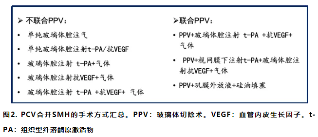 再者,手术治疗PCV合并SMH时,气动置换联合抗VEGF具有更好的视力获益、视网膜下注射比玻璃体腔注射t-PA更易使SMH移位、视网膜下注射t-PA的最佳时机为发病后7-10天、合并玻璃体积血时应考虑联合PPV手术;