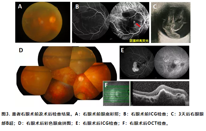 3天后,患者右眼视力突然下降至眼前手动, B超示右眼玻璃体积血(图3-C),遂于发病后第10天于我院行“右眼P+I+PPV+视网膜下注射t-PA+8%C3F8填充+抗VEGF”手术。术后1月复查时发现右眼SMH明显吸收(图3-D),ICG示polyps消退(图3-E),右眼BCVA也从术前的眼前手动提高至0.1。