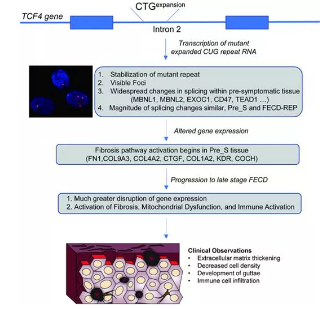 Fuchs角膜内皮营养不良(FECD)是最常见的遗传性疾病之一,影响了4%美国40岁以上人口。FECD是一种RNA介导的疾病,由TCF4基因内含子的三核苷酸CTG扩增引起。突变的内含子CUG-RNA在每个细胞中有一到两个拷贝,这对理解一个罕见的RNA如何引起疾病提出了挑战。基因缺陷如何触发导致迟发性疾病的分子变化,对于理解疾病进展和治疗进展具有重要意义。本研究的目的是了解扩增的CUG-RNA重复序列是否改变了前体组织中的基因表达,以及这种变化与FECD晚期已知的基因表达和表型变化之间的关系。FECD_REP是由突变体TCF4内含子RNA内的CTG三核苷酸重复序列引起的。从TCF4位点CTG扩增重复突变到晚期FECD的FECD分子和疾病进展(示意图如下)或许历经了几十年。