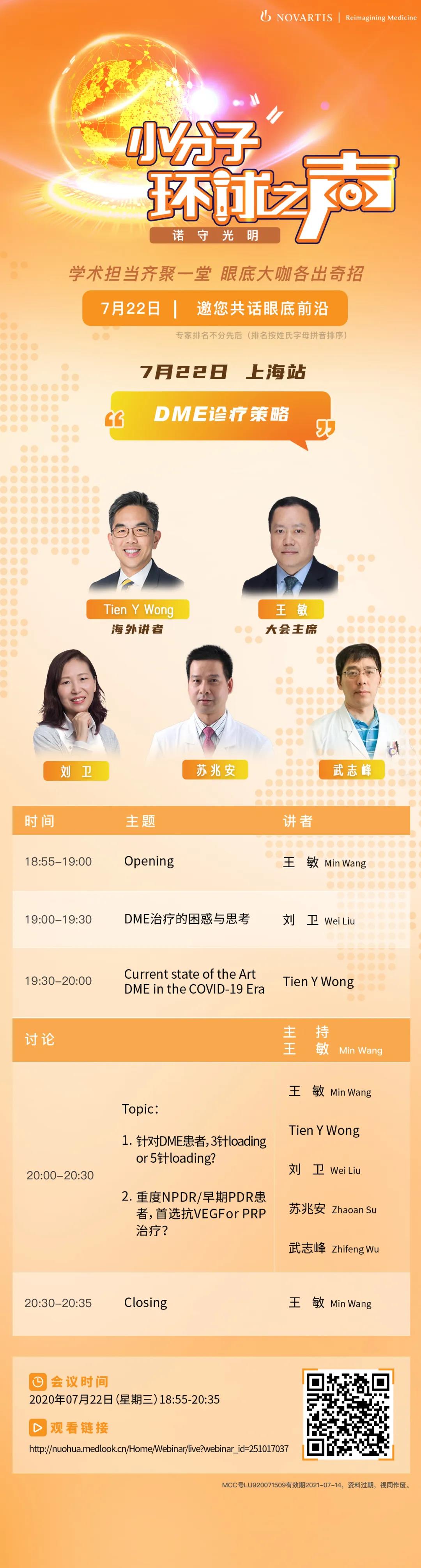 本次会议重磅邀请到复旦大学附属眼耳鼻喉科医院王敏教授和刘卫教授、浙江大学附属第二医院苏兆安教授、无锡市第二人民医院武志峰教授莅临线上“会议大厅”,两地专家强强联手,更有新加坡眼底病专家Tien Y Wong教授倾情加盟,以国际化视野、结合中国国情,定制一份独一无二的DME诊疗学术大礼包。还在等待什么,快快加入诺适得?小分子号的传奇旅程,领取这份惊喜!