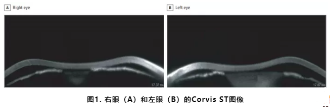 该团队使用了一种采用角膜可视化Scheimpflug技术的非接触式生物力学性能测量仪(Corvis ST,Oculus)对一位61岁患者进行眼压测量,Corvis通过喷气,以高速摄像方式记录角膜的形态变化。使用此设备测得患者的右眼眼压为8.6mmHg、左眼为8.1mmHg;右眼中央角膜厚度为547μm、左眼为544μm; 两眼前房角均较窄,右眼ACD为2.19mm、左眼ACD为2.12mm。