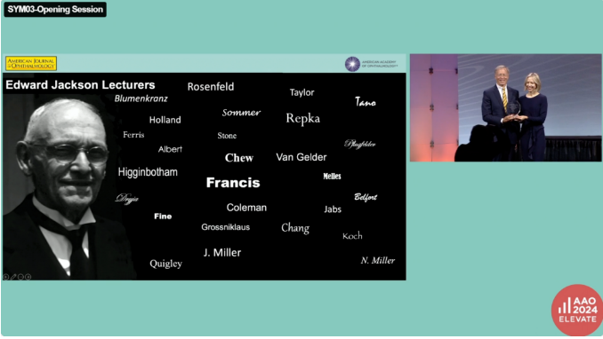 Jackson Memorial Lecture“杰克逊纪念讲座”向来是AAO开幕式上的重磅环节。2024年第81届“杰克逊纪念讲座”的演讲者为Jasmine H Francis教授,她是一位从事眼肿瘤学的临床科学家,目前就职于纪念斯隆-凯特琳癌症中心(MSKCC)。自加入MSKCC以来,Jasmine H Francis教授为眼动脉化疗术(OAC)的发展做出了杰出贡献,该治疗方法目前已在45个国家应用,使得视网膜母细胞瘤由一种致命性疾病演变为一种可以在保留眼结构和视觉潜力的同时进行治疗的疾病。除此以外,Jasmine H Francis教授还发表了关于葡萄膜黑色素瘤和良性黑色素细胞病变遗传学的重要研究,成果斐然。Jasmine H Francis教授在AAO2024开幕式的舞台上发表了题为“Histiocytosis Advancements Parallel Ophthalmic Innovations”的讲座,详细分享了团队已经完成和正在进行的研究,为与会者带来了很大启发。