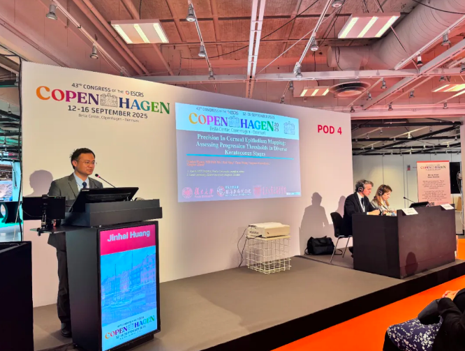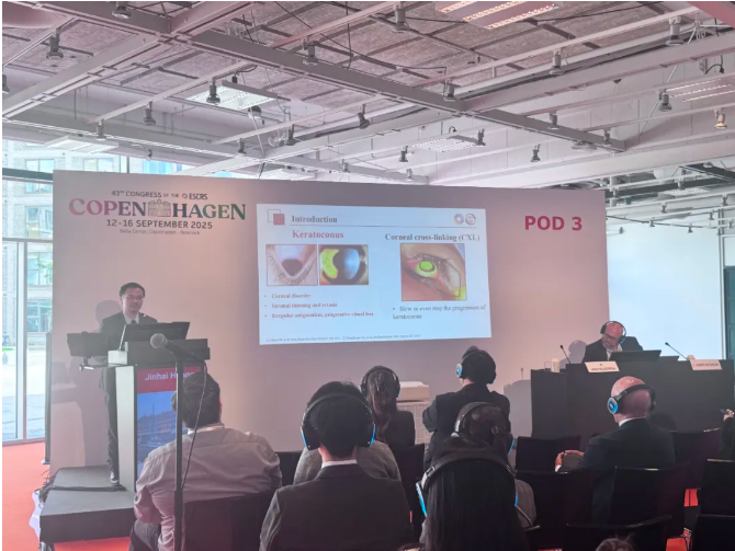 编者按:近期,第43届欧洲白内障与屈光外科医师学会年会(ESCRS 2025)在丹麦哥本哈根盛大举行。作为全球眼科领域极具影响力的学术盛会,此次会议吸引了众多国际顶尖专家与学者齐聚一堂,共探行业前沿动态。会议上,复旦大学附属眼耳鼻喉科医院黄锦海教授携团队最新研究成果精彩呈现。其研究聚焦圆锥角膜和角膜交联领域,为该领域的发展提供了新思路,为全球患者带来新的希望,获国际同行广泛关注与认可。