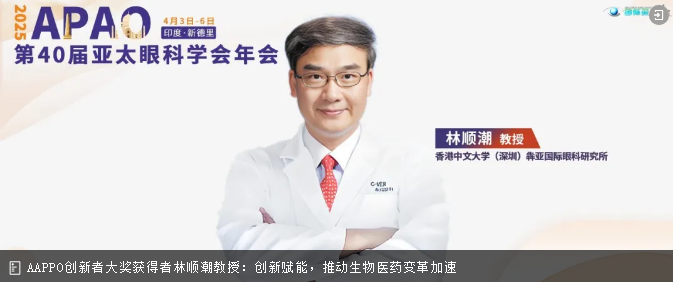4月3日-6日,第40届亚太眼科学会(APAO 2025)在印度新德里盛大启幕。会议现场群贤毕至,学术氛围浓厚。来自世界各地的眼科专家跨越山海,齐聚于此,共同开启这场眼科学术盛宴。自2021年起,亚太眼科科学院设立了极具分量的“创新者大奖”,该奖项每年在全球评选出一位在眼科及视觉科学有突破性研究和重大贡献的眼科教授。本届APAO大会上,香港中文大学(深圳)犇亚国际眼科研究所所长林顺潮(Dennis S.C. Lam)教授凭借卓越的科研成就和深远的影响力,荣耀当选为本届AAPPO创新者大奖的获得者。在大会的主旨演讲环节,林顺潮教授以全球化视野和丰富的产学研医实践经验,为与会者带来了一场关于生物医药创新最新趋势的深度剖析。