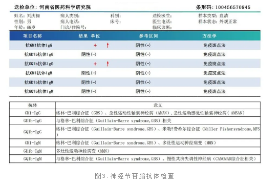 腰穿检查:颅内压正常,行脑脊液查神经节苷脂检查抗GQ1b抗体(+),抗GM1抗体(+)。