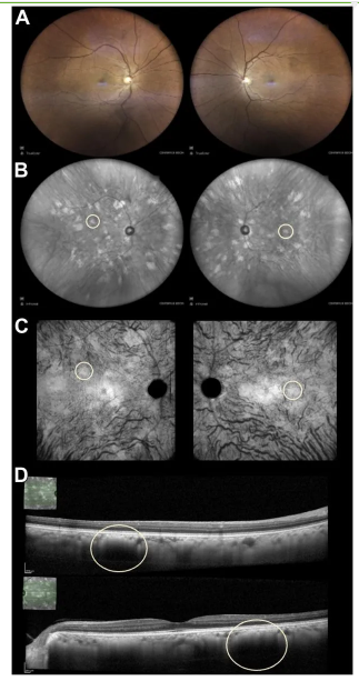 在深部脉络膜12×12mm平面光学相干断层扫描图像(图C)及双眼横断面光学相干断层扫描图像(图D)中,相应的脉络膜结节(以黄色圆圈标示)均呈现高反射性。