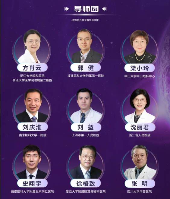 厦门大学附属厦门眼科中心黎晓新教授、上海市第一人民医院孙晓东教授、复旦大学附属眼耳鼻喉科医院徐格致教授、中山大学中山眼科中心梁小玲教授、四川大学华西医院张明教授、浙江省人民医院沈丽君教授、江苏省人民医院刘庆淮教授、浙江大学眼科医院(浙江大学医学院附属第二医院)方肖云教授、福建医科大学附属第一医院郭健教授、首都医科大学附属北京同仁医院史翔宇教授、上海市第一人民医院刘堃教授——11 位业内权威专家组成顶级导师团,将凭借深厚的学术积淀与丰富的临床经验,为中青年医师的玻切成长之路精准导航。