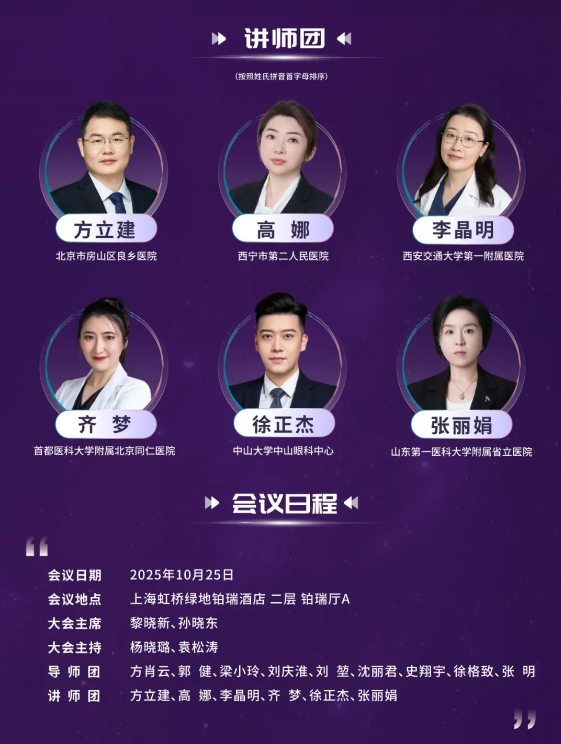 西安交通大学第一附属医院李晶明医生、首都医科大学附属北京同仁医院齐梦医生、山东第一医科大学附属省立医院张丽娟医生、西宁市第二人民医院高娜医生、中山大学中山眼科中心徐正杰医生、北京市房山区良乡医院方立建医生——6 位优秀中青年医师赢得今年全国各地的分赛角逐,脱颖而出,他们将带来临床一线的实践案例与创新思考,展现当代中青年眼科医师的技术实力与学术活力,为会议注入新鲜思维与多元视角。