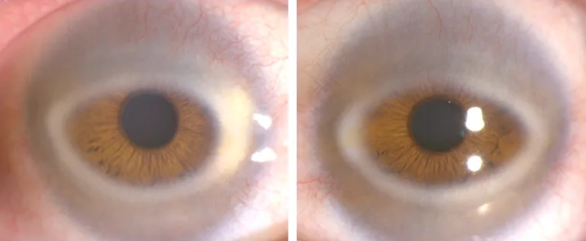 裂隙灯检查:双眼睑结膜轻度充血,双眼周边角膜灰白色混浊,伴浅层新生血管向中央延伸,角膜中央区保留横椭圆形透明区(右眼5.8mm×3.5mm,左眼5.6mm×3.4mm)。