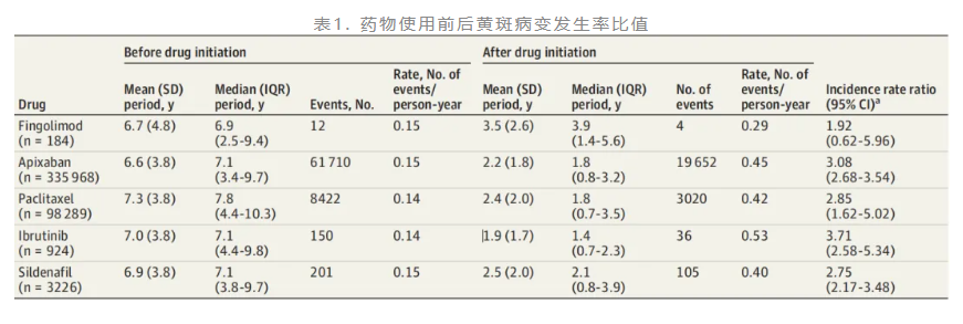 编者按:JAMA Ophthalmology最新发表的大规模研究[1]再次引发对某些全身性药物黄斑病变风险的关注,其中部分药物属于已确认风险类别,另一些则为新发现的潜在关联药物。通过创新性地结合药物警戒数据与真实世界保险理赔数据,研究者识别出五种与黄斑病变相关的全身性药物,其中四种——芬戈莫德、阿哌沙班、紫杉醇、伊布替尼及西地那非,存在显著可量化的风险。