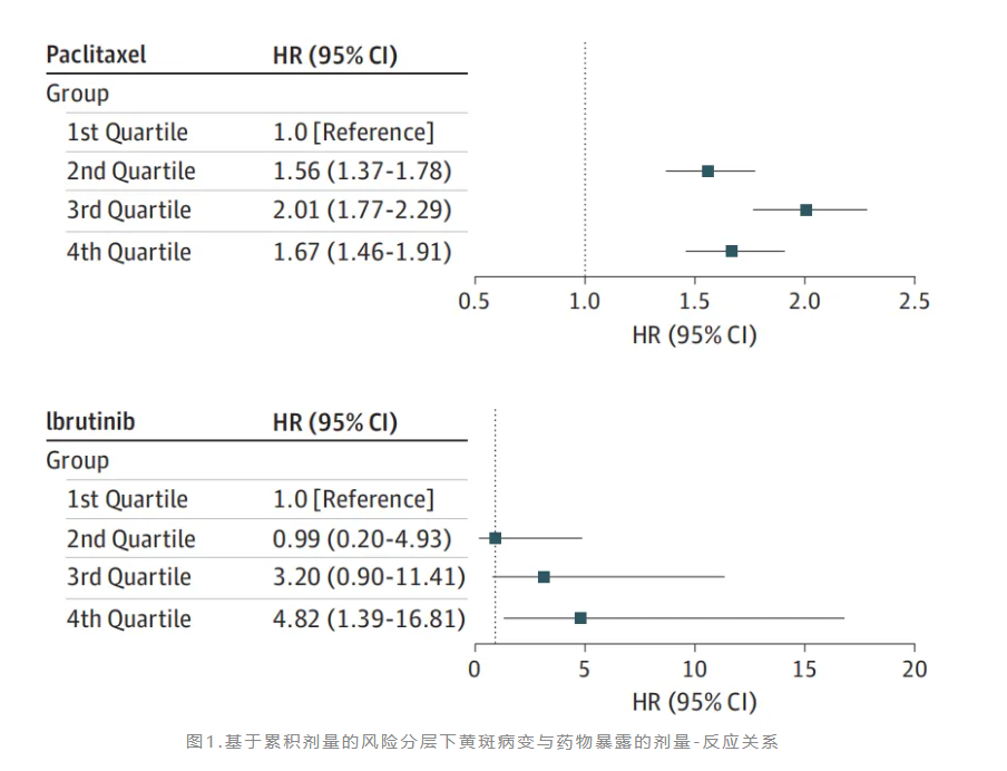 (二)不同药物的黄斑病变模式存在差异:芬戈莫德和紫杉醇主要与黄斑水肿相关,符合其血管通透性作用的已知机制;阿哌沙班、伊布替尼及西地那非则更多引发类黄斑变性改变,提示缺血性或退行性作用通路。值得注意的是,紫杉醇与伊布替尼均显示出明确的剂量-效应关系——风险比随着累积暴露量增加而攀升。