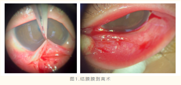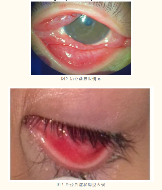 通过全身麻醉下膜剥离、冷敷、局部糖皮质激素与抗生素用药及聚维酮碘冲洗等支持性管理方案,患儿症状在一周内显著缓解,眼痛逐渐改善。