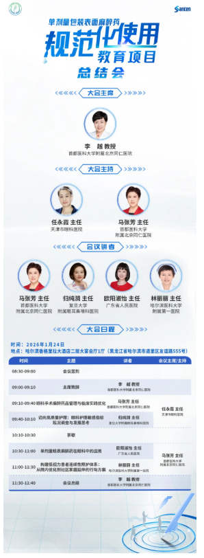 为全面总结项目经验、展示项目成果,“单剂量表面麻醉药规范化使用教育项目总结会”定于2026年1月24日在黑龙江省哈尔滨市召开。本次会议由首都医科大学附属北京同仁医院李越教授担任大会主席,天津市眼科医院任永霞主任和首都医科大学附属北京同仁医院马张芳主任共同主持,数位国内眼科护理领域资深专家将聚焦单剂量包装表面麻醉药临床实践核心议题展开深度分享,为推动我国眼科诊疗事业的高质量发展注入新的活力。