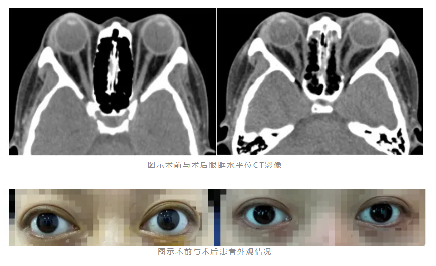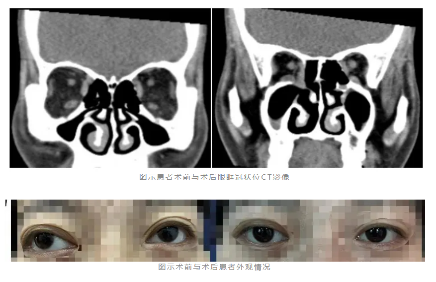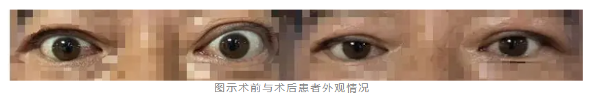 在一例以美容改善为主要诉求的年轻女性患者中,团队在疾病静止期采用内镜下经蝶筛入路眶内侧壁联合眶脂肪减压术。术前患者眼球突出度:19mm>-96mm-<20mm,术后眼球突出度为14mm>-96mm-<15mm,眼睑退缩和眼周外观得到显著改善,且未出现复视等并发症。