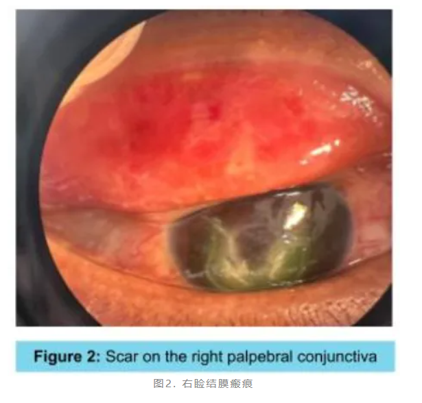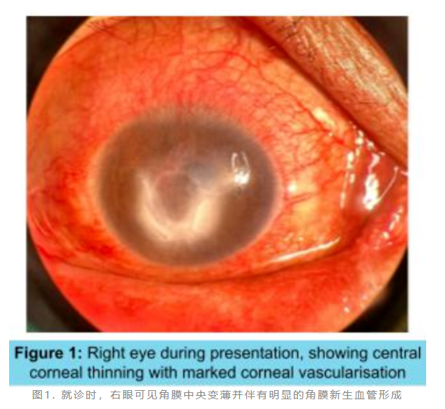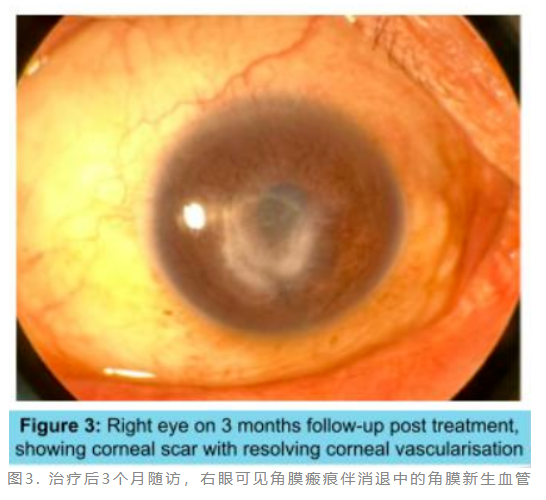 图3. 治疗后3个月随访,右眼可见角膜瘢痕伴消退中的角膜新生血管