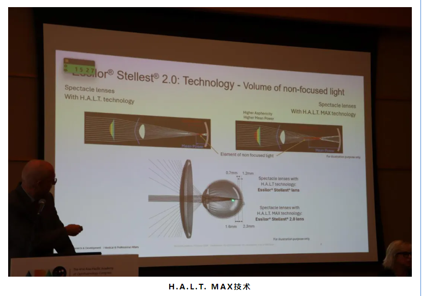依视路陆逊梯卡研发部应用近视研究总监Bjorn DROBE博士以“延缓近视进展的新一代框架镜片:H.A.L.T. MAX镜片”为题,揭晓了H.A.L.T.技术的研发背景、技术创新及临床验证成果。初代H.A.L.T.技术通过11圈同心圆、1021个微透镜在视网膜前形成稳定的三维近视性离焦信号。基于微透镜形成的眼轴增长抑制信号存在最佳效果区间的推断,团队后续开发了搭载H.A.L.T. MAX技术的第二代镜片,增加了微透镜的屈光力及非球面性,2倍非聚焦信号区,形成了分布区域更广、离视网膜更远的焦散面。得益于镜片周边的微透镜环之间的清晰视觉环,儿童的中心视力与治疗区视力表现无显著差异,保障了主要视觉质量。
