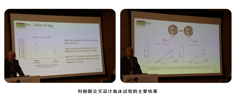 在新加坡开展的采用对侧眼交叉设计的临床试验中,每名儿童的双眼分别配戴初代与第二代镜片。结果显示,第一阶段(6个月内),H.A.L.T. MAX镜片减缓眼轴增长的效果优于初代镜片,这一优势在第二阶段(交叉换镜后,12个月)仍然保持。按8.5岁分层后,H.A.L.T. MAX技术镜片在低龄组和高龄组的防控效果均优于初代,且在低龄儿童中延缓近视进展效应更显著。与初代镜片相比,H.A.L.T. MAX技术镜片可使儿童一年眼轴增长额外减少0.11 mm,同时保持了同等的视觉质量和配戴依从性。