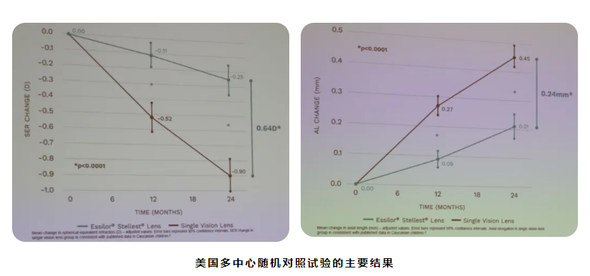 支持FDA上市许可的美国多中心随机对照试验的两年数据显示,H.A.L.T.镜片组儿童近视进展减少71%(0.64D)、眼轴增长率减少53%(0.24 mm),且安全性良好,视觉质量与单光镜片无差异。配戴的儿童在每次随访中单眼最佳矫正视力(BCVA)平均可达1.0,且在24个月时,有97%的儿童每只眼的最佳矫正视力达到1.0或更好。此外,34%受试眼2年内近视完全无进展,75%的受试眼近视进展幅度<0.5D,高于安慰剂组的36%。此外,法国近视研究所发布推荐,从4岁起可为儿童验配近视防控框架眼镜,同时也建议将其应用于20岁或更年长的儿童与青少年。