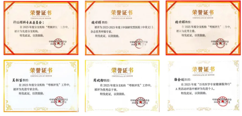 与此同时,在2025年度分支机构考核评先工作中,神经眼科专业委员会凭借扎实的工作成效与突出的行业贡献,斩获多项荣誉,充分彰显了学科团队的强大凝聚力与综合实力。其中,神经眼科专业委员会获评先进分支机构,魏世辉教授履职尽责、引领有方,获评优秀主委,同时凭借在学术评审领域的严谨态度与专业素养,斩获2023-2025年度《中国研究型医院(中英文)》杂志优秀审稿专家称号;吴松笛教授深耕履职、实绩显著,获评先进专家委员;周欢粉教授恪尽职守、统筹高效,获评优秀总干事;徐全刚教授积极投身公益、践行医者使命,因在健康服务中的突出表现,被评为“百名医学专家健康服务行”活动先进个人。一众荣誉的加持,为学科高质量发展凝聚了更强信心与奋进力量。