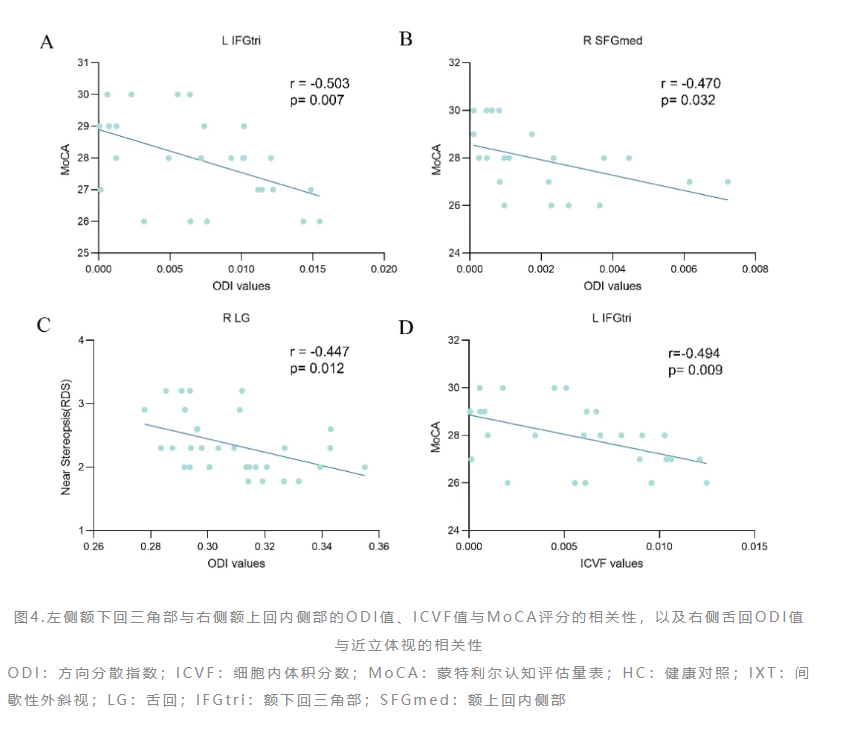 本研究发现的上述脑区微结构异常,与既往功能影像学研究相互印证。例如,Fei等人报道基本型IXT儿童左侧舌回和右侧枕下回的低频波动振幅降低,提示其视觉空间注意与记忆功能可能受损[5]。此外,参与立体视和空间信息处理的枕中回[13,14]、负责三维视觉运动的颞中回[15],以及与视觉识别和高级信息整合密切相关的眶额皮层[16],在本研究中均显示出微结构改变。这与先前在共同性斜视成人患者中观察到的眶额皮层皮质变薄[17]及颞中回灰质/白质体积减少[18]等结构性异常相一致,提示轴突组织紊乱可能导致相关脑区功能障碍及发育异常。值得注意的是,本研究还发现右侧舌回的轴突方向分散指数(ODI)值与近立体视锐度呈负相关(图4),即ODI降低(轴突方向一致性增高)伴随近立体视恶化。此外,在双侧楔前叶、左侧楔叶、枕上回及顶上回等视觉相关皮层,本研究观测到ODI值升高,提示这些区域可能存在轴突方向一致性降低。这些脑区分别涉及视觉-前庭整合[19]、高级视觉联合处理[20]以及眼动和空间信息加工[21]。这意味着高级视觉相关皮层轴突连贯性丧失,而神经突起密度保持不变。