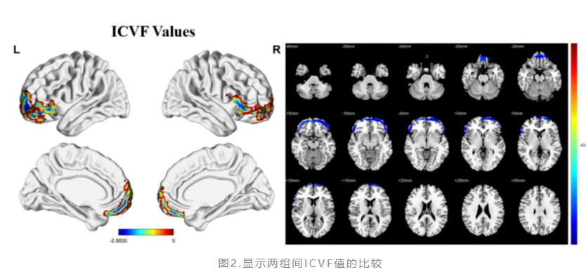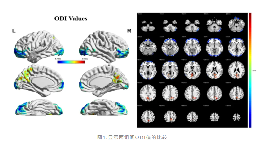 ODI值主要与轴突扇形分布方向有关,ODI越高,说明分散性越大,更趋于扇形分布,ODI值越低,说明轴突分布越集中;ICVF主要表示神经密度,ICVF降低表明神经密度减少;ISOVF主要与细胞外自由水相关,ISOVF增加与细胞外水肿和神经炎症有关,ISOVF降低可能与细胞增殖相关。